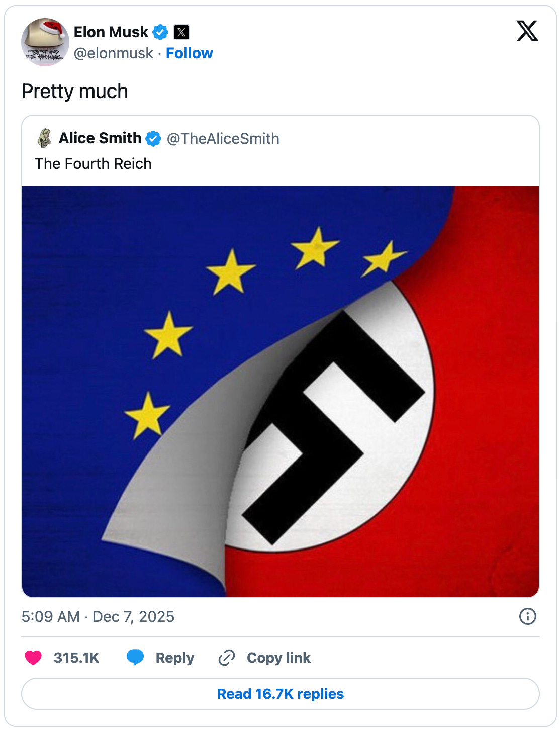 Last week X terminated the European Commission’s advertising account. Days after the EU fined them €120 million for transparency violations, a corporation punished a regulatory body for enforcing its own laws — with Musk calling the EU the “Fourth Reich” for good measure.